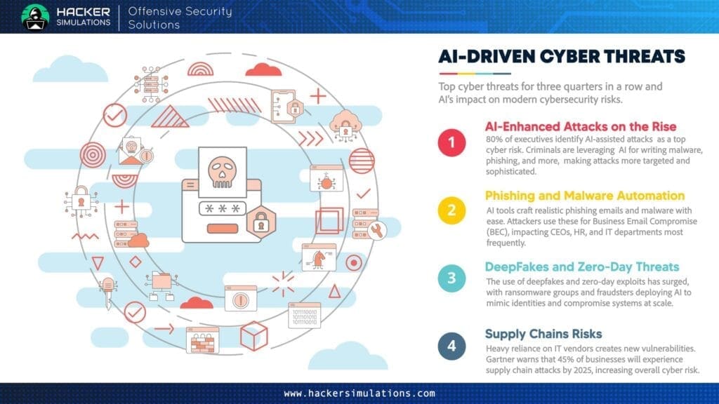 - AI-Enhanced Attacks on the Rise:(Ref) 80% of executives identify AI-assisted attacks as a top cyber risk. Criminals are leveraging AI for writing malware, phishing, and more, making attacks more targeted and sophisticated.